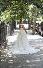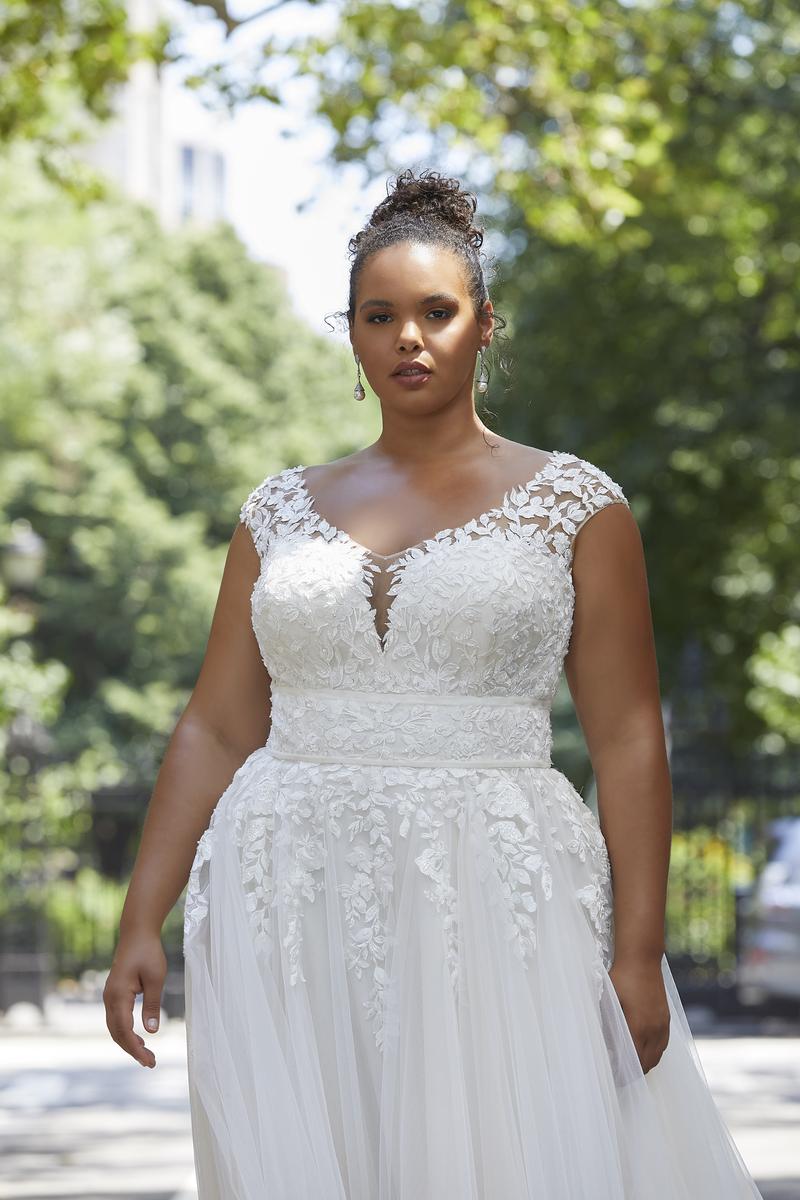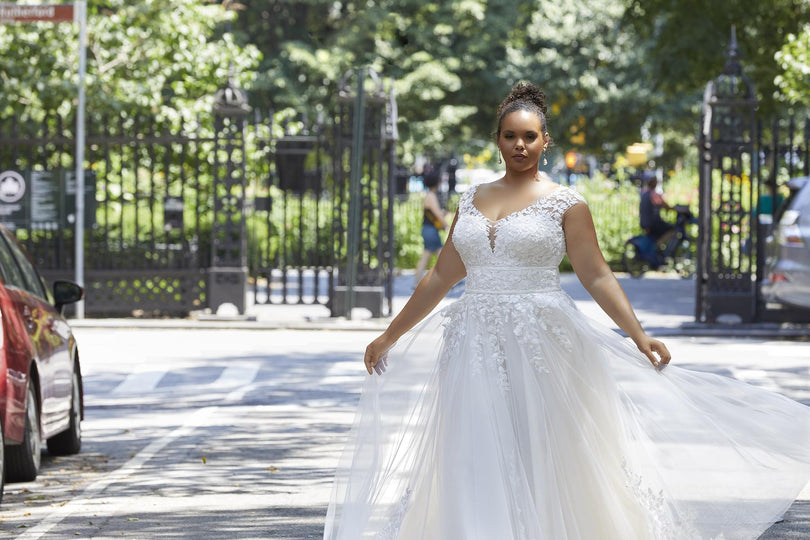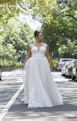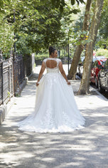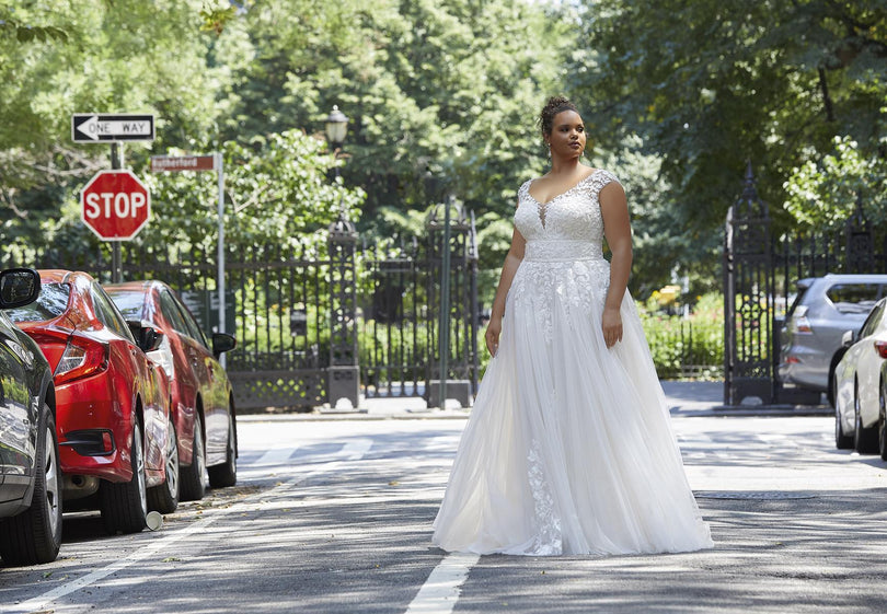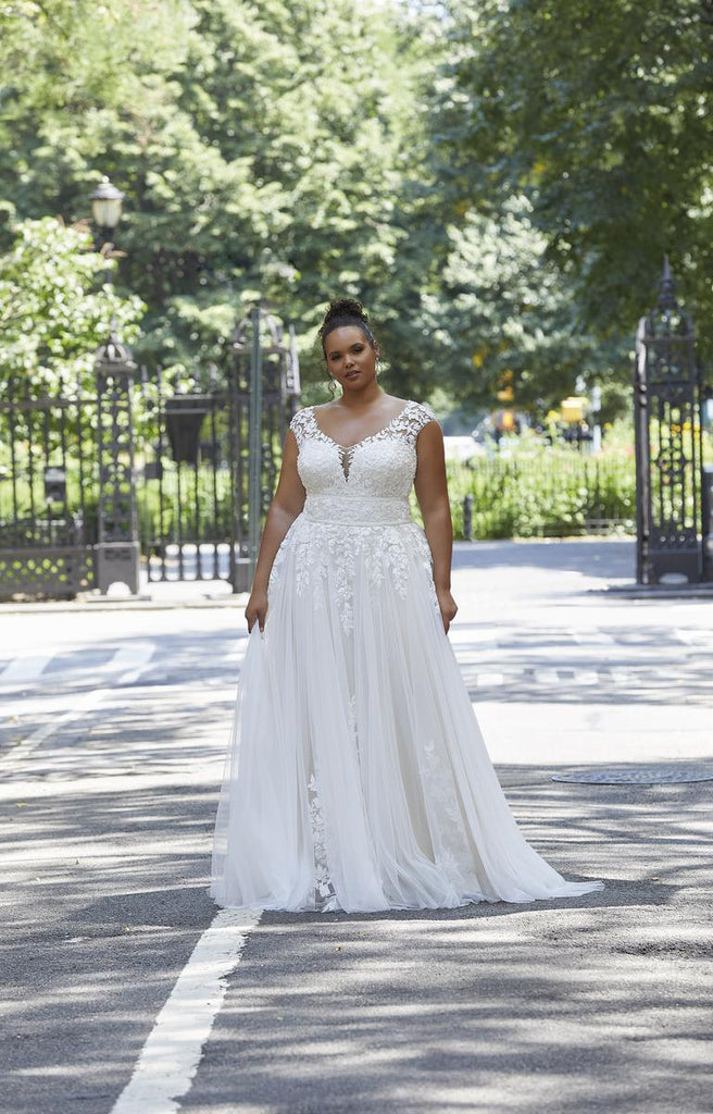 The name of this Julietta Plus Size Bridal by Morilee wedding dress is HadleyEffortlessly elegant, our Hadley designer wedding dress a boho dream with botanical-inspired crystal beaded embroidered lace appliqus cascading down from the sheer v-neck bodice. The double waistband detail cinches in your figure on the soft tulle A-line that has an ethereal effect with peek-a-boo appliqus. The best part is the open keyhole back that will wow your guests as you walk down the aisle. Shown in Ivory/Prosecco/Honey. Available in three lengths: 55", 58". 61".