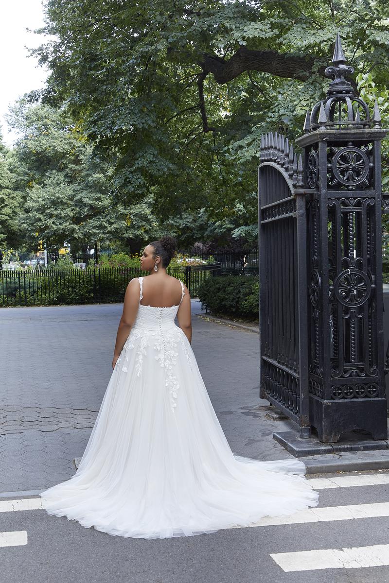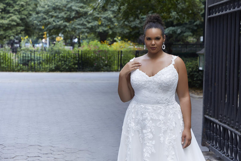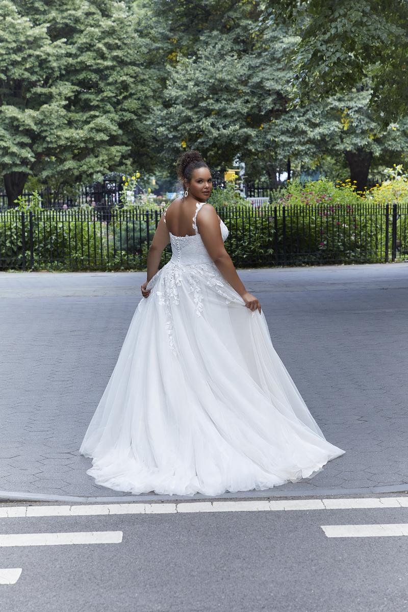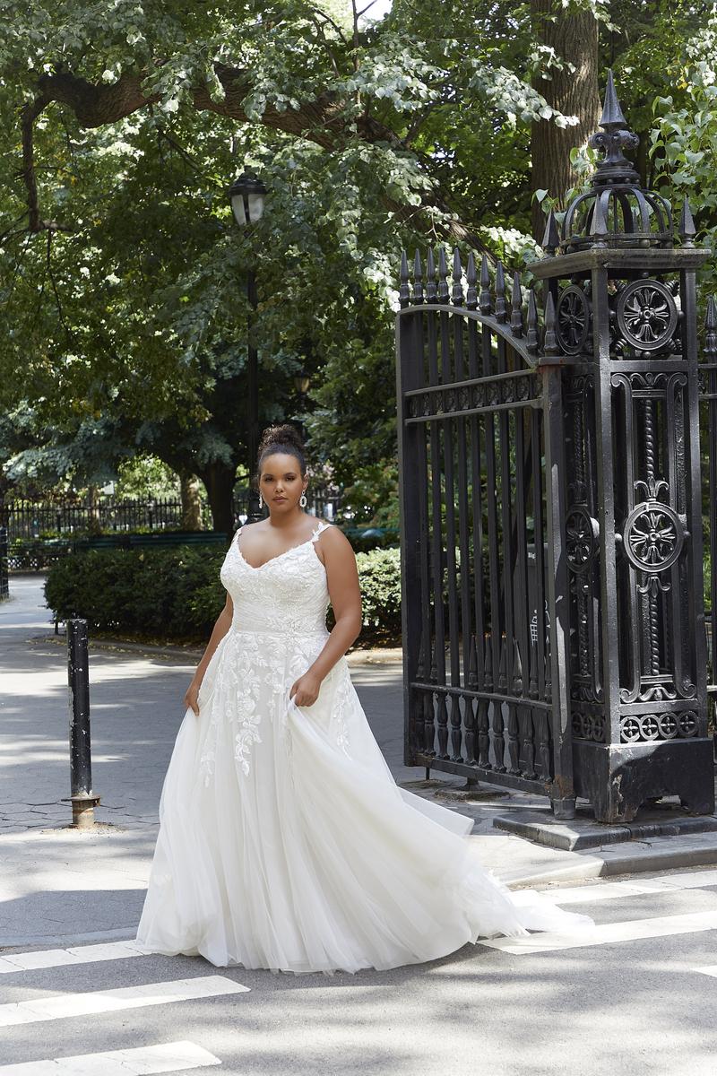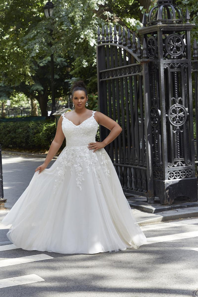 The name of this Julietta Plus Size Bridal by Morilee wedding dress is HaleyOur Haley designer wedding dress is a heavenly ball gown with enchanting details. The romantic Chantilly lace bodice features a classic v-neckline and delicate straps designed with stunning frosted, embroidered lace appliqus that cascade down into the billowing tulle skirt. Draped net cinches in the waist enhancing the dreamy ball gown silhouette. Shown in Ivory/Prosecco.