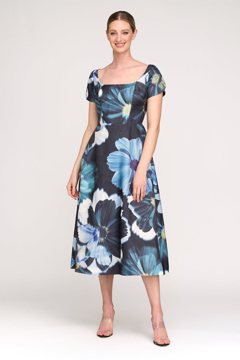 Featuring an organza layer over a Mikado base, this cocktail dress highlights the Cosmo flower print with soft, striated shadowing. Tulip sleeves and a flared skirt create a graceful, nature-inspired silhouette.