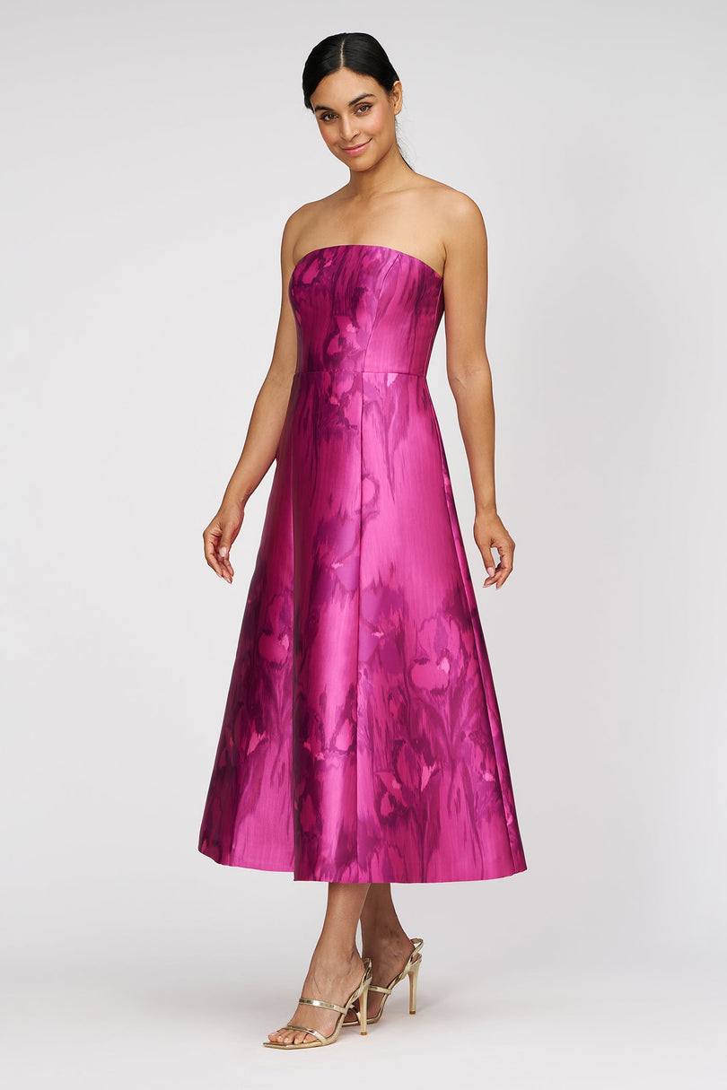 The Natalie Tea Length Dress showcases a breathtaking iris print on sumptuous mikado fabric, blending bold artistry with refined elegance. Designed in a romantic strapless silhouette, this A-line dress flatters with its graceful shape and tea-length hem. Thoughtful details like functional pockets add a modern, practical touch to this timelessly feminine piece. This item is a Final Sale.