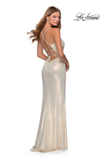 Shine the night away in this gorgeous dress by La femme that highlights a low v neckline along with a strappy open back. A delicate ruching effect that adorns the bodice for a slim fit. 28363 is Made in a sparkly jersey fabric, this fitted ensemble showcases a captivating thigh-high slit.Making this the perfect gown for a sorority formal, Prom night or any Black-tie event.