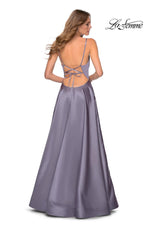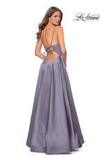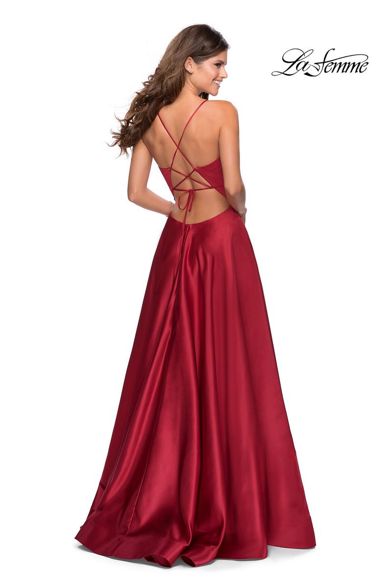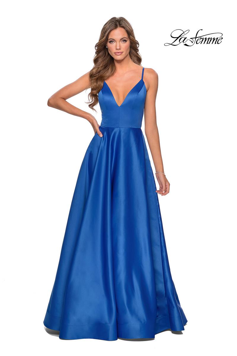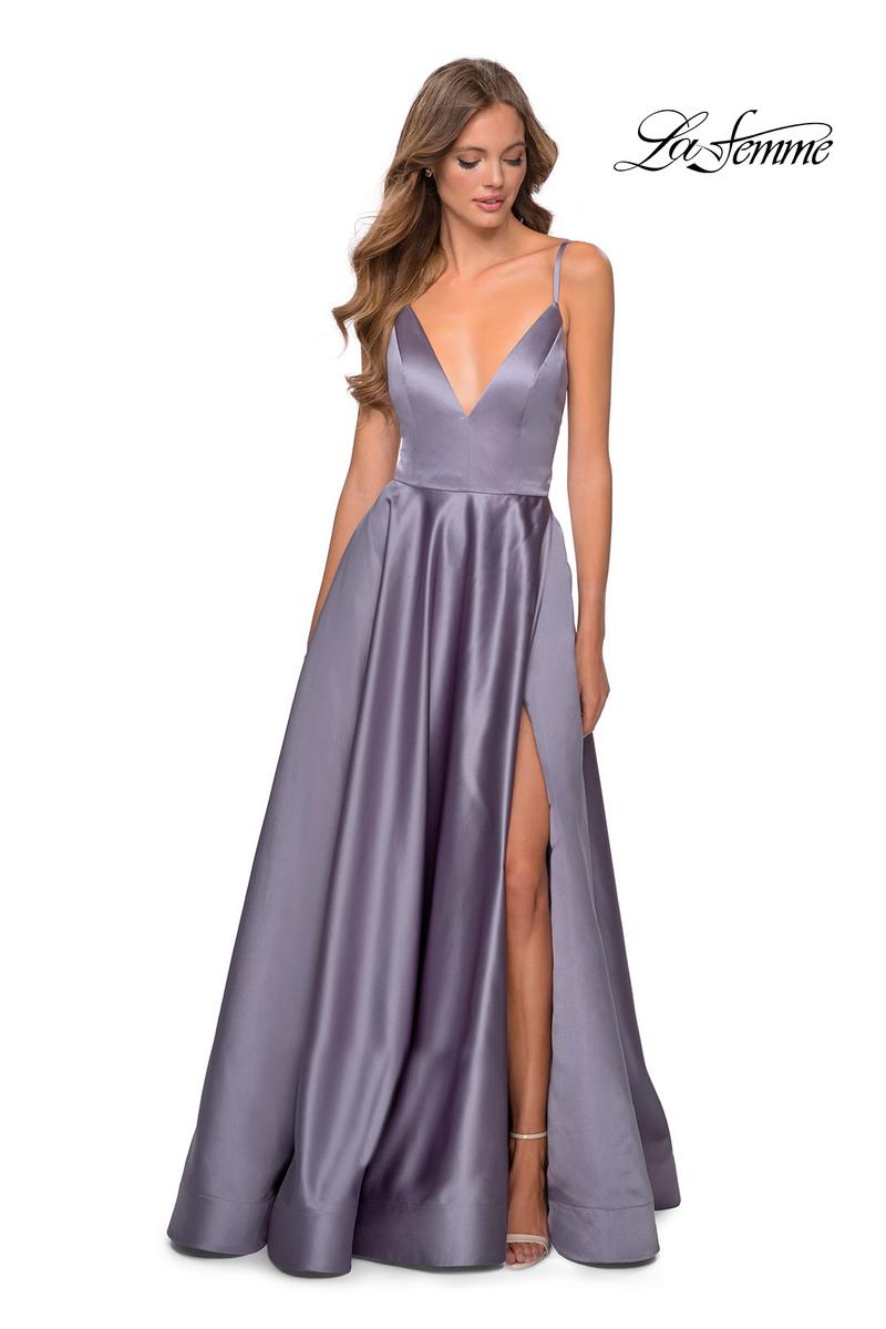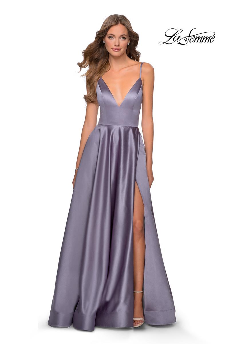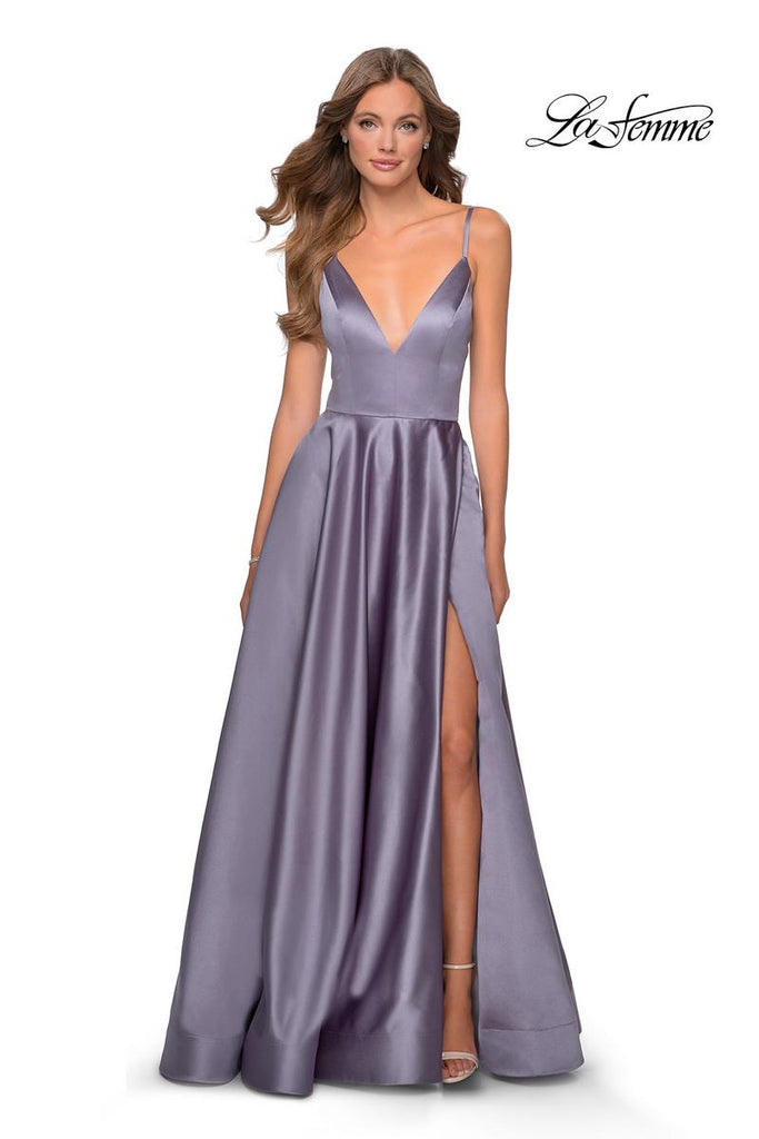 Turn heads in this stunning simple Aline gown by La Femme. 28628, showcases a plunging v-neckline with dainty satin straps that lead into a corset back. An alluring side front slit that adds a touch to the delicate satin skirt that flows with you as you dance the night away! Find this look at Terry costa!