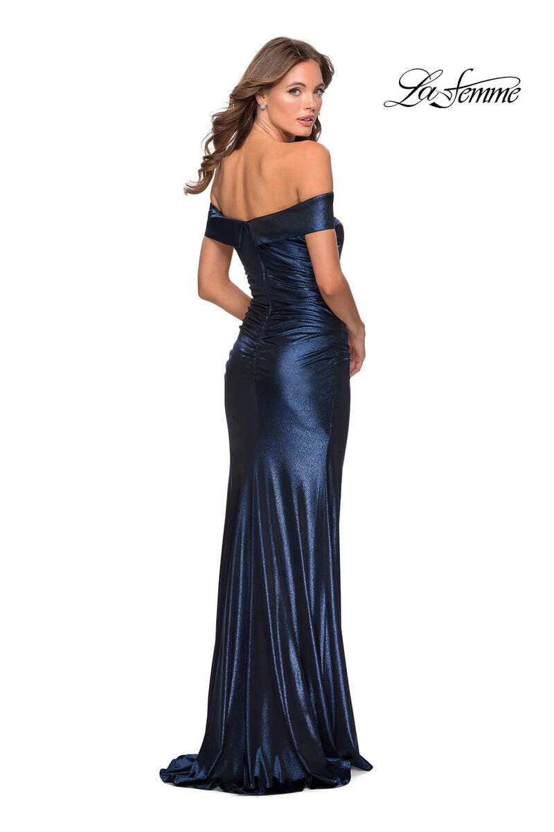 Rock the runway in this elegant and trendy long prom fitted prom dress by La femme! Style 28740 is perfect for any occasion with its metallic, jersey material and off-the-shoulder detailing! This gown is form-fitting and has a figure-flattering back ruching detail. This gown is available in navy and peach, the perfect choice for your special occasion!