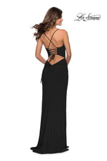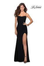 Be Black-tie ready in this simple gown by La femme that features a straight across scoop neckline with thin straps. Along is a lace-up back for easier adjusting. 28792, is made of jersey fabric,not only will you be comfortable but also show off those curves. A finshing touch of a thigh high leg slit.
