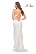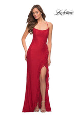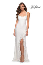 Walk with class in this glamorous figure flattering formal gown! This La Femme,29650, showcases a scoop neckline with thin straps that form into an eye catching adjustable lace up back! The fitted gown will high your figure perfectly and is fully adorned in lovely lace and a thigh high leg slit with lace trims! Make this your go to gown for any Outside formal or School dance !