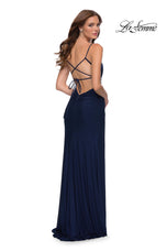Pure elegance is this navy blue formal gown from La Femme designer. 29699, showcases a v-neckline, thin straps and an open lace-up back. The fitted gown that will show off your figure and a side leg slit.