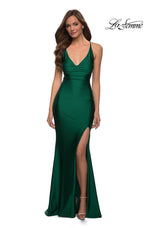 Make a grand entrance in this stunning long formal gown. This La Femme gown, 29785,showcases a deep v neckline with thin straps that form into an adjustable lace up back. The fitted gown is made of jersey fabric and is finished off with a sweep train!