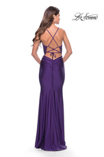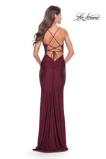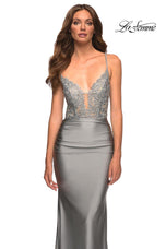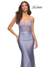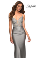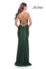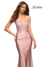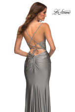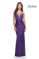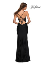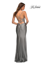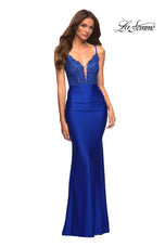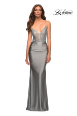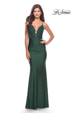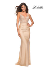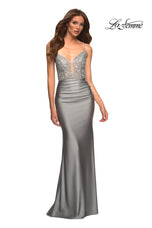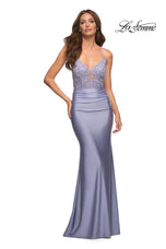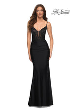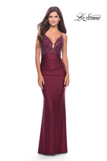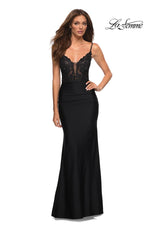 La Femme style 30466 is a sexy mix of lace and jersey. The sheer lace top with plunging illusion neckline is embellished with rhinestones that catch the light beautifully! The simple jersey skirt is ruched around the hips for an ultra flattering fit. The look is not complete without a strappy lace up back detail. This would be an excellent choice for your next soiree!