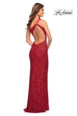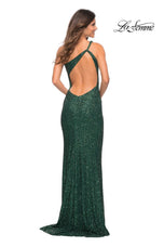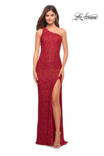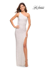 Make a statement in this gorgeous long sequined prom dress, Style 30562, by La Femme. It features a one shoulder strap that cascades into a unique open back and a sultry high leg slit. Call Terry Costa today to check availability on this hot style!