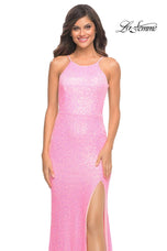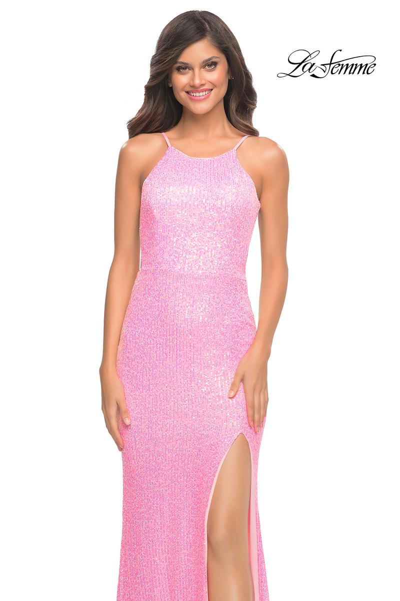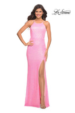 Shine bright under the lights! This figure flattering long sequined prom dress is the perfect attire for you! 30638, has a modest high neckline with sequined bodice and a front leg slit for a sexy touch! Call Terry Costa for availability on this stunning gown!