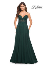 Unique floor length A-line evening gown with chiffon skirt. Features a sheer bodice with floral lace embellishments and rhinestone detailing. Back zipper closure. Dress comes in cloud blue, garnet, and nude under style number 28543.