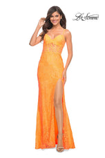 Unique and on trend in this long lace prom gown designed by La Femme. 30671, features a sheer bodice with a soft v-neckline and straps that create an open lace-up back for a snug fit. The scattered rhinestones will have you sparkling under the lights! Perfect for Prom or Black-tie!