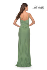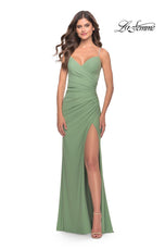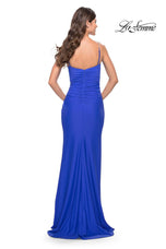 We are loving the vibrant tones on this figure flattering gown designed by La Femme from Spring 2023 Collection. 31107, showcases a sweetheart v neckline with thin spaghetti straps that are dazzled up! The jersey gown has soft ruching to give you the hourglass effect. A sexy leg slit completes this stunning look. Perfect for Senior Prom, College formal and much more.