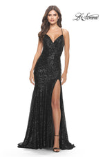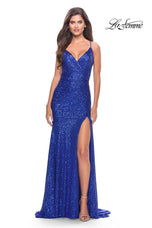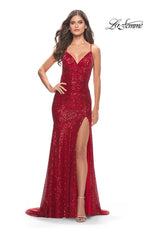 Look and feel like a million bucks in this stunning long evening gown designed by La Femme. The silhouette is beautifully adorned with delicate sequin details. The top has a v neckline with spaghetti straps that convert into an eye-catching lace-up back for snug fitting. A sexy thigh-high leg slit and sweep train that will sway with every step that you take!