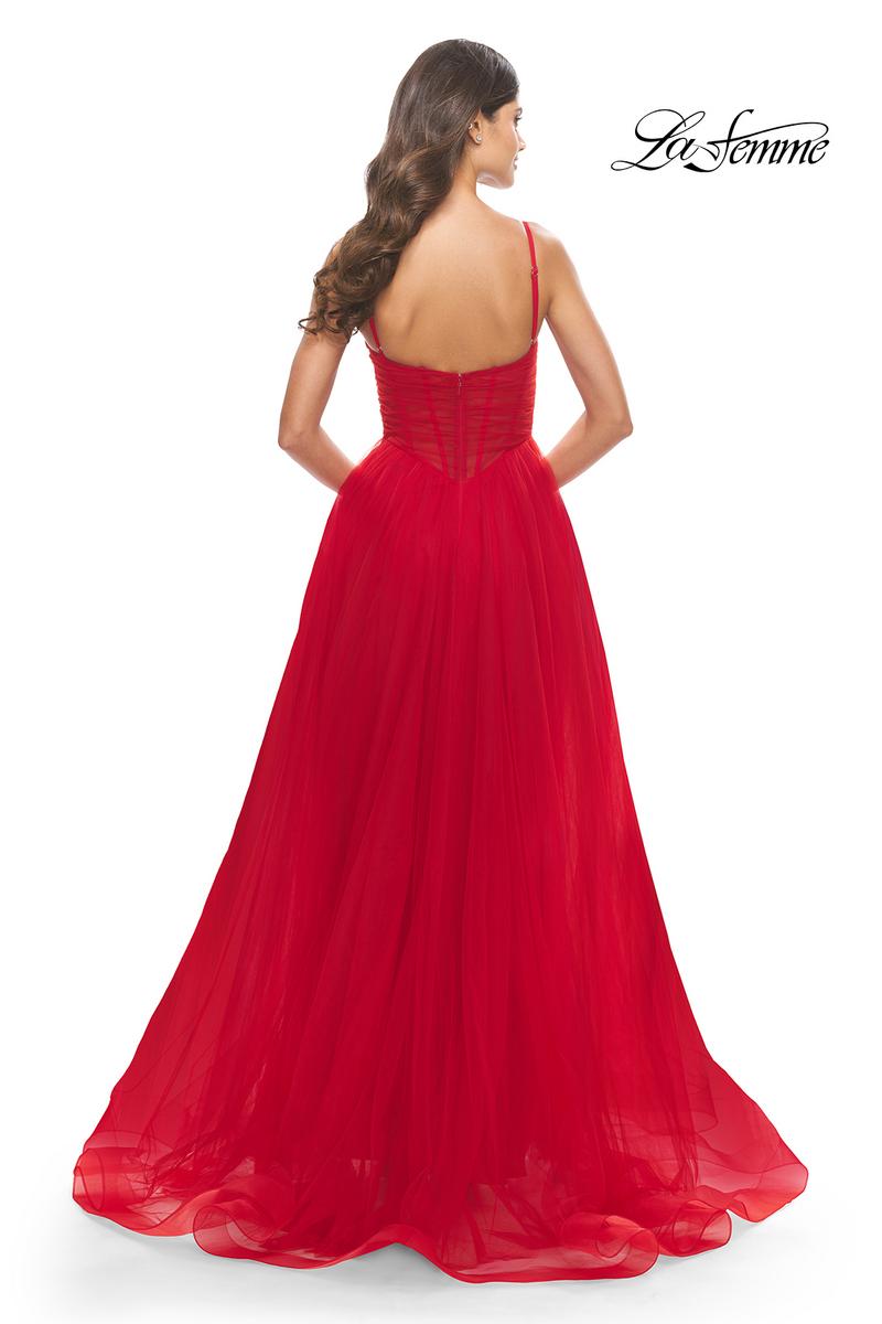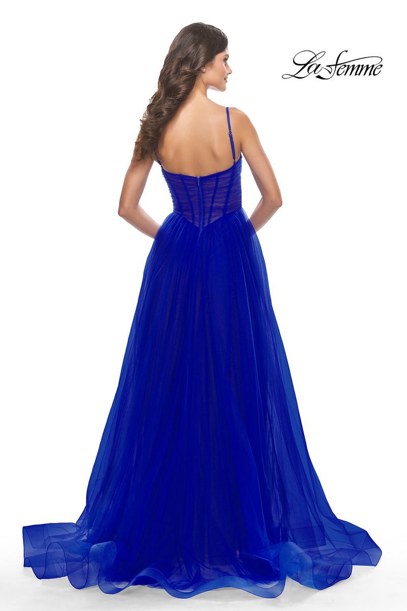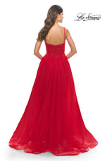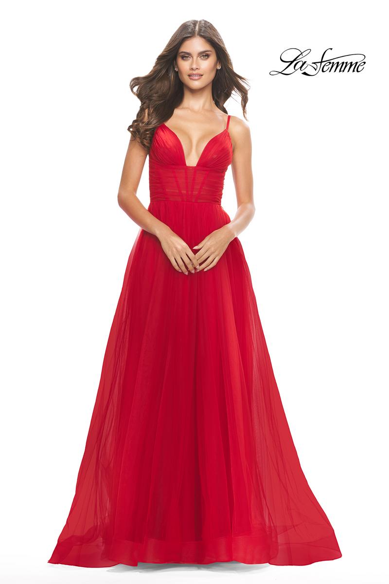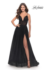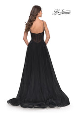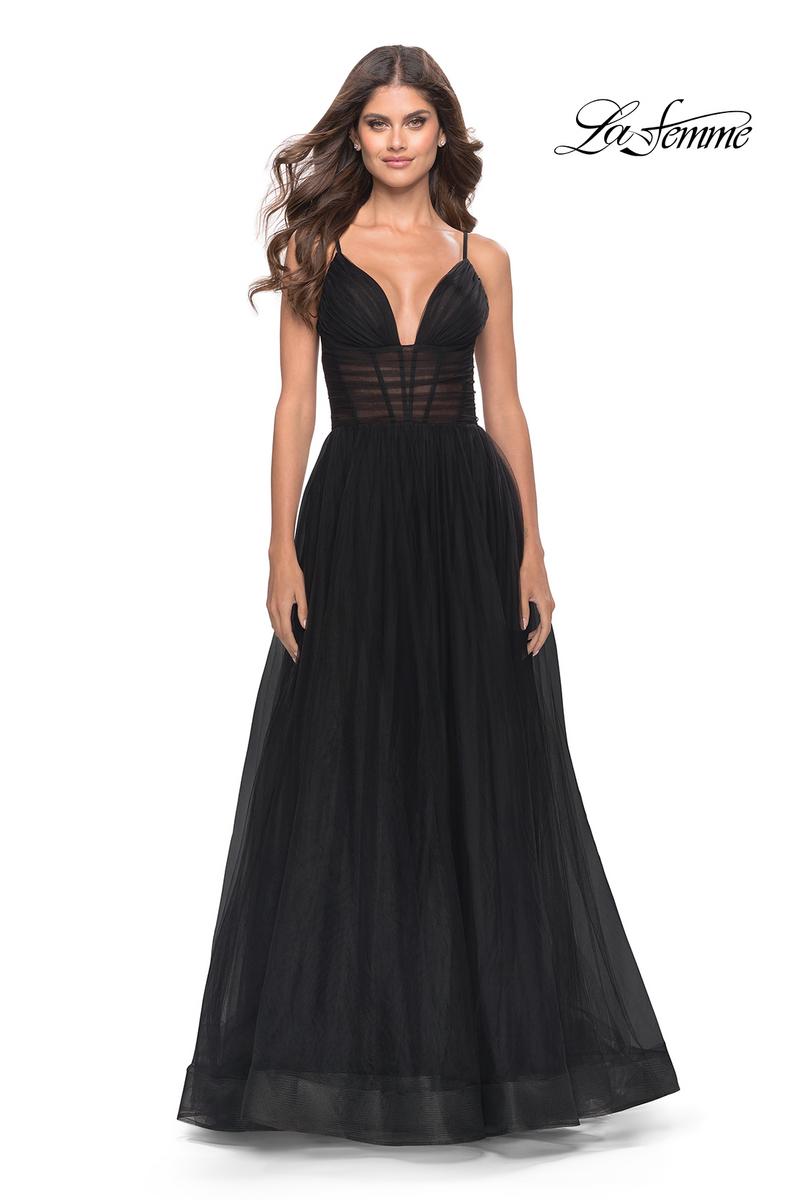 Turn in to Wednesday Addams with this stunning black Aline gown from La Femme from Spring 2023 Collection. 31147, is designed with a sexy v neckline, thin straps, sheer corset bodice for a snatched waistline and low zipper back. The full skirt is voluminous and has a sexy leg slit. The horsehair hem adds volume to it all. Dont miss out on this stunning gown for Senior Prom and much more.
