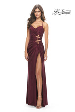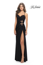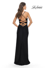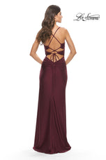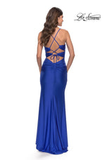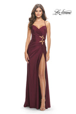 Take a fashionable chance in La Femme style 31174. This long prom dress has a stunning draped neckline supported by thin shoulder straps. The ruched fit and flare silhouette has cute yet daring side cutout accents. A sexy high slit gives this gown an elegant Grecian vibe that we know you'll love. Stealing the show is an eye catching lace up open back. If you are looking for a long formal gown or a prom gown to put you at center stage then we have the dress for you.