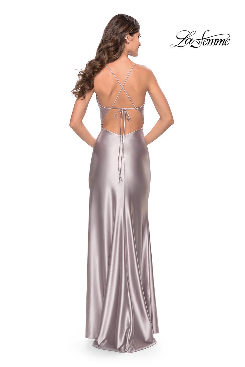 Stay elegant in this metallic liquid satin gown designed by La Femme from Spring 2023 Collection. 31208, will define your curves perfectly and has a rich fabric! A scoop neckline with spaghetti straps that forms into a lace-up back for easier adjusting. A sexy thigh-high leg slit and sweep train finish the look! Dont miss out on this sexy yet classy gown.