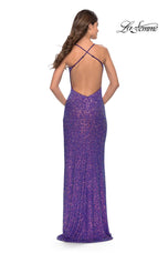 A hot piece designed by La Femme from Spring 2023 Collection. 31209, showcases a soft sweetheart neck, thin adjustable straps thst crisscross to the back. The fitted gown is fully decorated with stunning sequins that will have you shinning from all angles! A sexy side leg slit and sweep train complete this look.