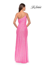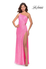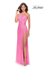 Pretty In Pink! 31213, showcases a modest one-shoulder neckline with thin strap that has a side cutout for unique touch. THe side cutout will define the bodice and is completed with ruching. Finished with a fully sequined gown that will sparkle under the dance floor lights.