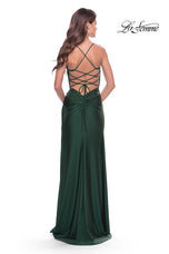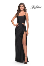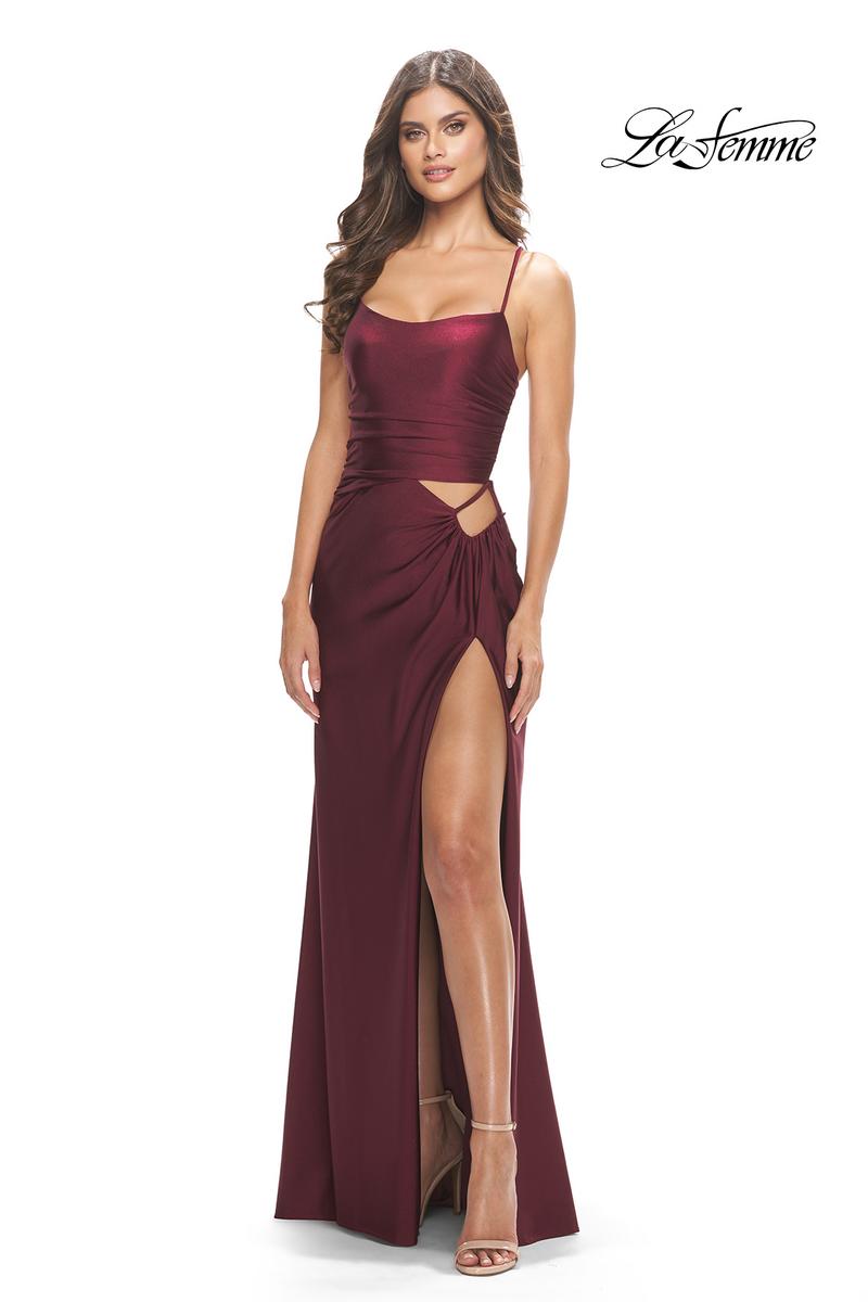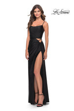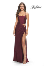 Embrace your uniqueness in this elegant La Femme gown for any social event! 31332, is from Spring 2023 Collection showcases a scoop neckline, thin straps that create this stunning lace-up and scrunched back. The jersey material will define your curves just right. The gown is completed with a stylish side cutout, sexy leg slit and train that will sway.