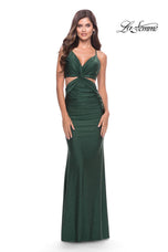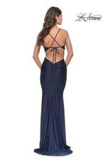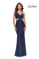 Have all eyes on you in this gorgeous La Femme gown, style 31339. The v neckline is complimented with deep side cutouts that are finished with ruching. The thin straps that create an eye-catching lace-up on the open back and heat stone that cover the entire gown for a touch of sparkle!