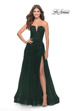 We are loving this dark berry tone gown by La Femme from Spring 2023 Collection. 31345, showcases a strapless v neckline with fitted bodice, and lace-up back for a snug fitting. The fitted bodice is adorned with sparkling lace detail that cascades onto the full tulle skirt. The gown is completed with a side leg slit and sweep train!