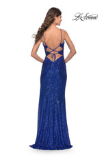 A vibrant and flirty gown designed by La Femme from Spring 2023 Collection. 31356, showcases a v neckline with middle cutout, thin straps that form into an open lace-up back and zipper closure. The gown is beautifully adorned with glittering sequins and finished with a side leg slit. Perfect attire for many events!