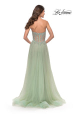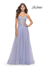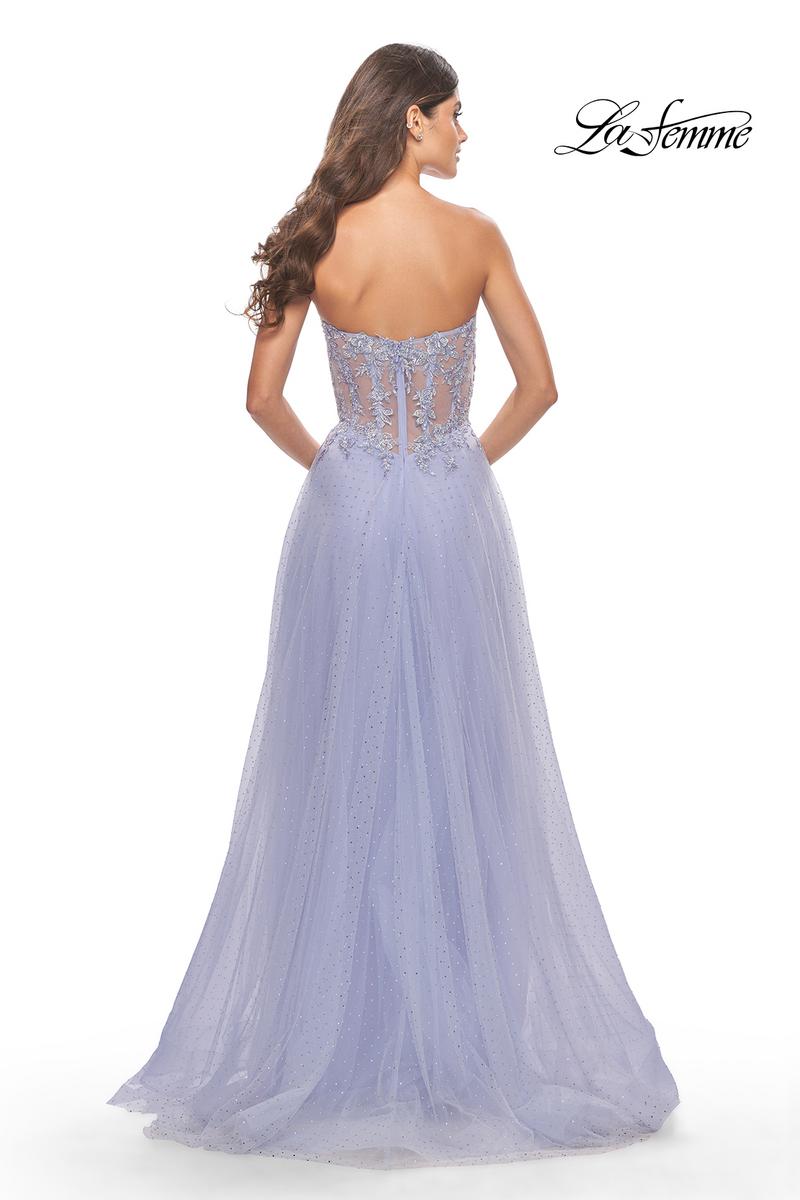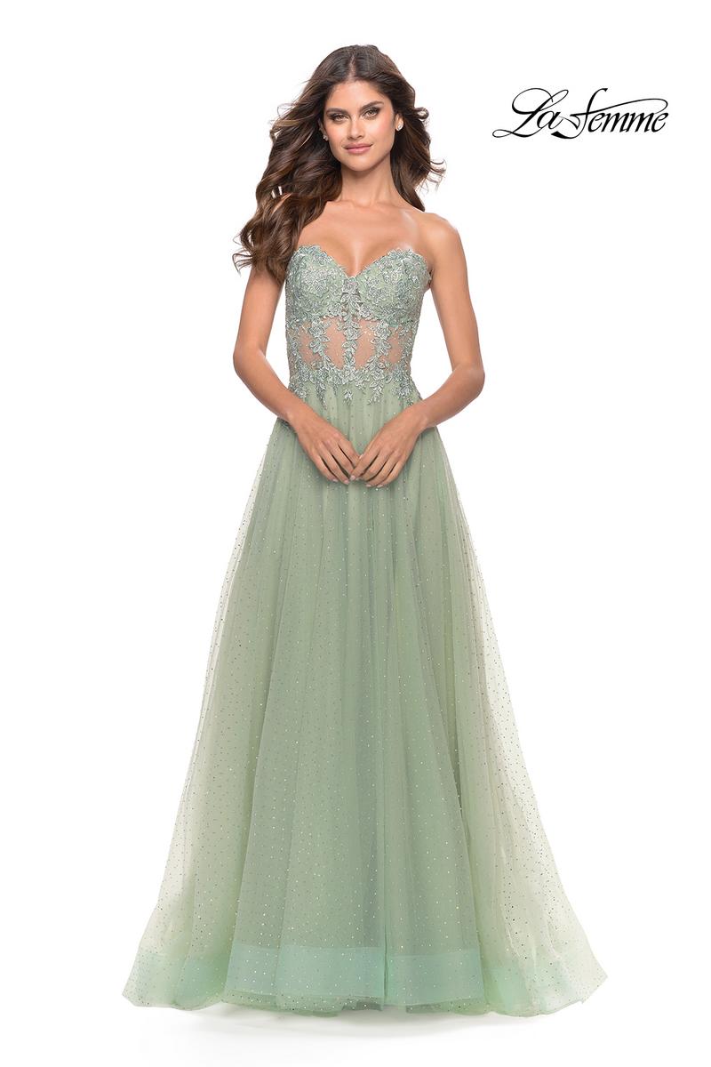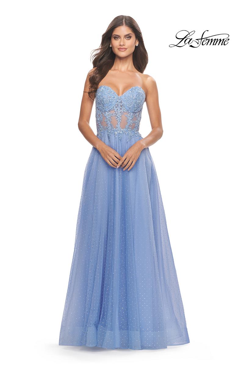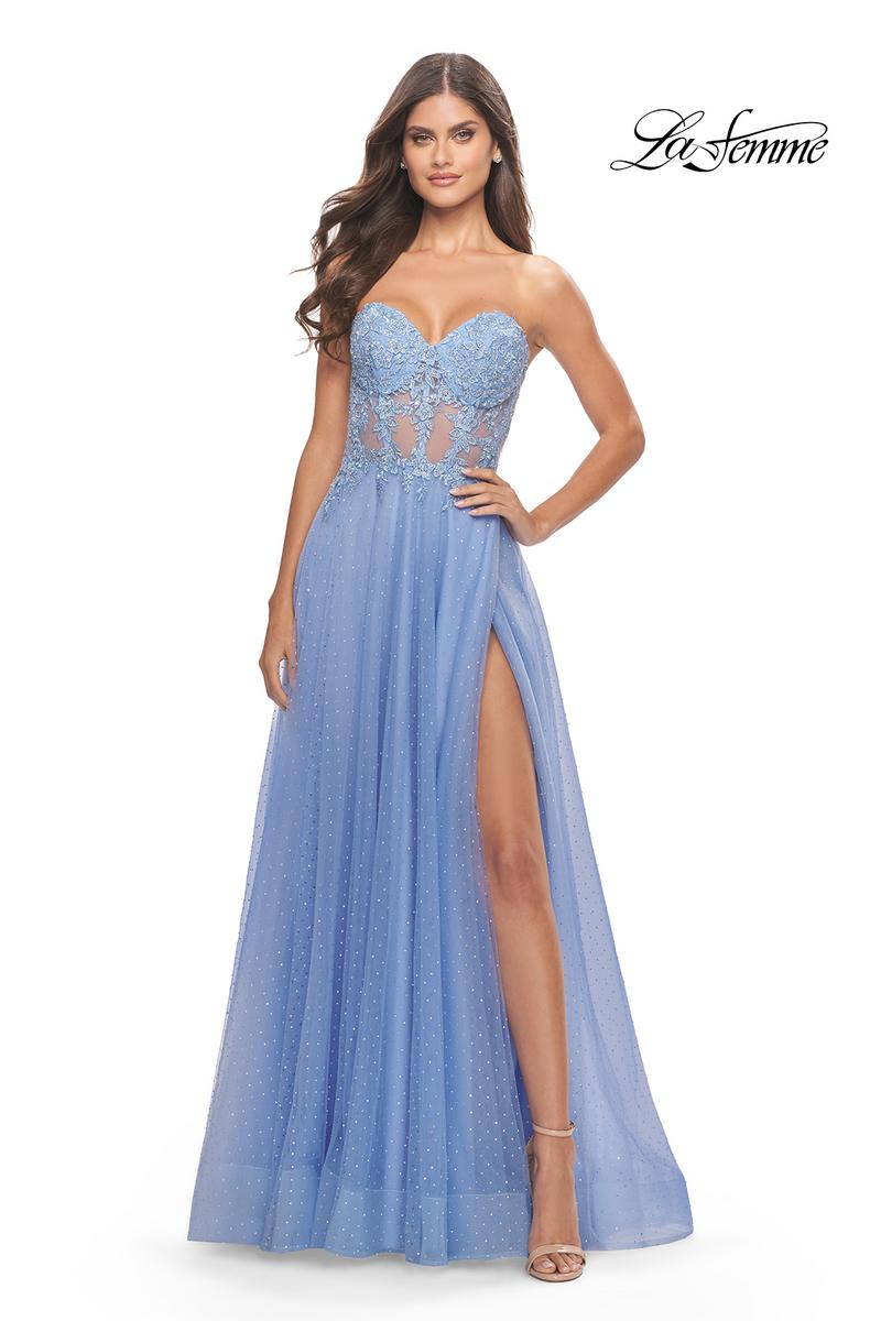 This La Femme gown is ethereal from La Femme. 31367, is from Spring 2023 Collection that showcases a strapless sweetheart neckline, fitted sheer bodice that will accentuate your waistline, and beaded lace detail. The Aline gown has a flowy glitter tulle skirt that will sway with every step that you take! The gown is completed with a side leg slit and horsehair hem for volume. Dont miss out on this gem for any social event.