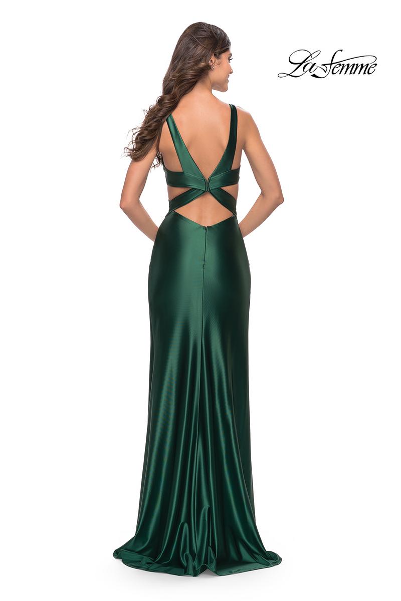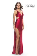 This one-of-a-kind gown is made just for you! 31374, is designed by La Femme from Spring 2023 Collection, showcasing a v neck with side cutouts and thick straps that create this unique crisscross back. The gown is completed with a sweep train.