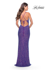 Yes Queen! Shine bright like a diamond in this fully sequined gown by La Femme from Spring 2023 Collection. 31430, showcases a plunged v neckline, thin straps with lace-up on open back. The fitted gown will define your figure just right. A sexy leg slit and sweep train finish this gorgeous look!