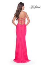 Stand out from the crowd in this vibrant La Femme gown designed by La Femme from Spring 2023 Collection. 31439, features a sexy plunged v neck with knot detailing. The fitted jersey gown will define your figure and is completed with a lace-up back.