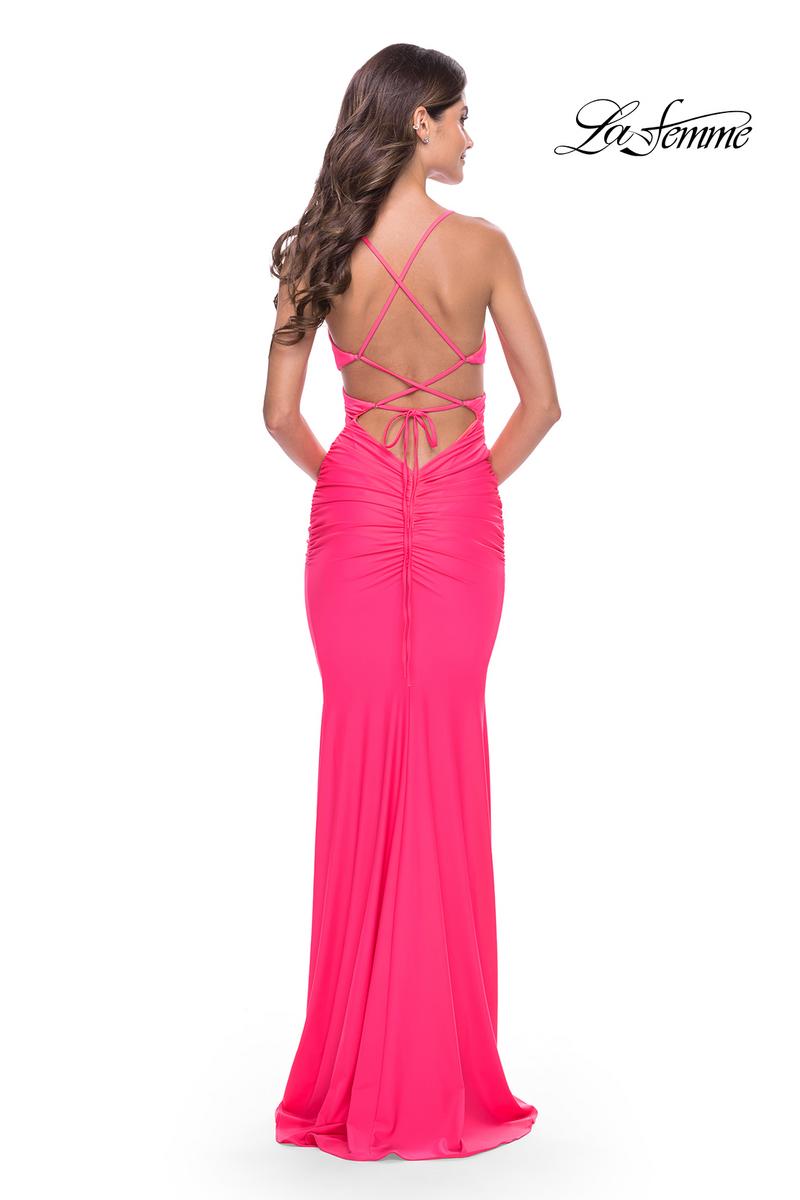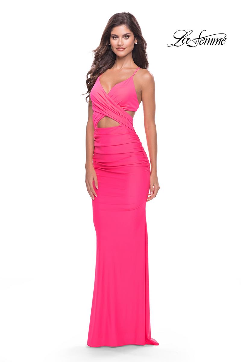 This La Femme gown is such a flirt! 31442, is a La Femme piece from Spring 2023 Collection, that showcases a v neckline with a fun wrap effect that defines the waistline. Thin straps that form into a lovely lace-up back for snug fitting. Make this gown your go-to for any special event.