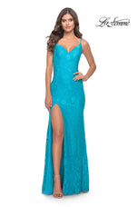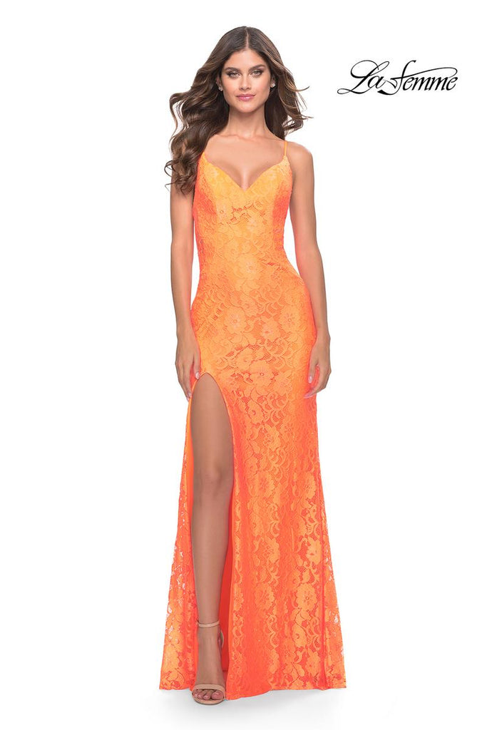 Stand out from the crowd in this gorgeous vibrant gown by La Femme, style 31513. The v neckline has thin straps, zipper back closure, and side leg slit. The entire gown is made in lovely delicate floral lace. Dont miss out on this gem for any social event.