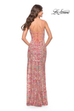 Have all eyes on you in this unique gown designed by La Femme from Spring 2023 Collection. 31528, has a scoop neckline with thin straps that forms into an eye-catching lace-up back for a snug fitting. The beaded gown is embellished with unique scale like patterns. A slit and sweep train complete this gorgeous gown.