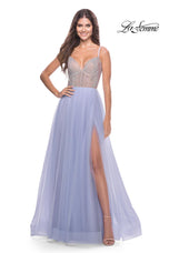 It's a party, bring out the tulle! La Femme does just that with style 31578! This flirty gown has a faux corset bodice covered in hot stones showcasing exposed boning. As a conrast to the dazzling top, layers of tulle create the a-line skirt. Of course they had to add a slit! Wear this look for Prom, Gala, birthday photoshoot, and ,more!