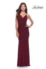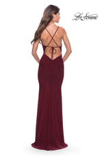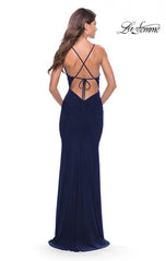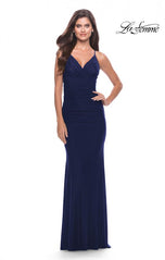 Show off your curves in this body conscience dress from La Femme style 31585. This long jersey prom dress has beautiful ruching that is sure to show off your fabulous silhouette. This stunning dress also has a beautiful v-shaped neckline and trendy lace up back that gives us all the feels. If you are looking for a prom dress or a special occasion dress then shop right here at Terry Costa