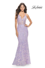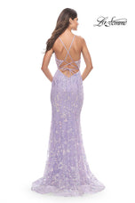 This sexy and flattering prom dress by La Femme 31596 features a plunging v-neckline and an illusion bodice that are adorned with sparkly floral sequin embellishments. The fitted silhouette features an open back with lace-up detailing. Perfect for making a show-stopping entrance at your next special occasion!