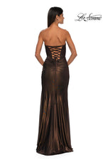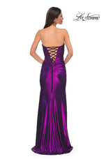 The fabric in this La Femme Prom style is Metallic Net Jersey