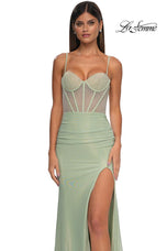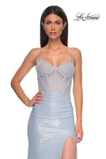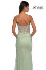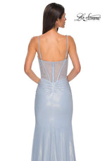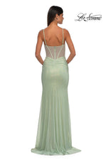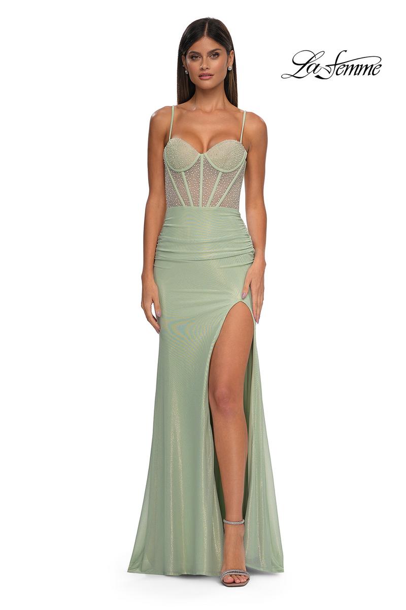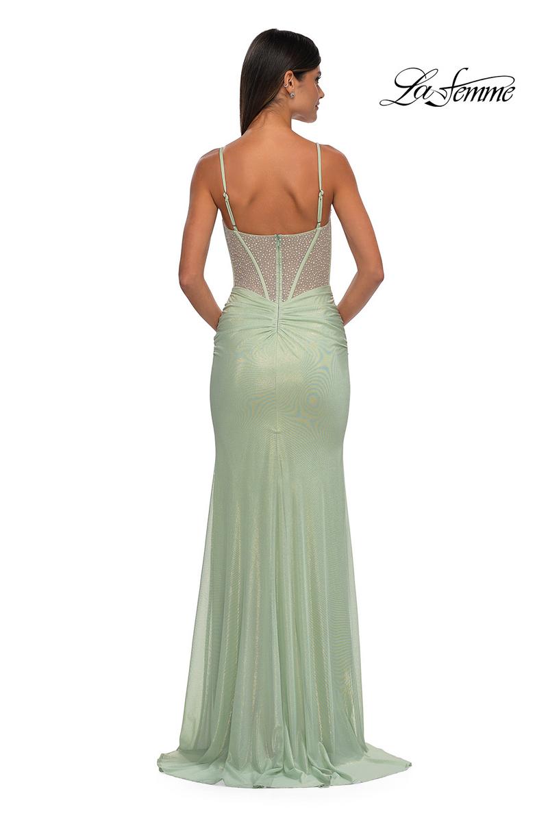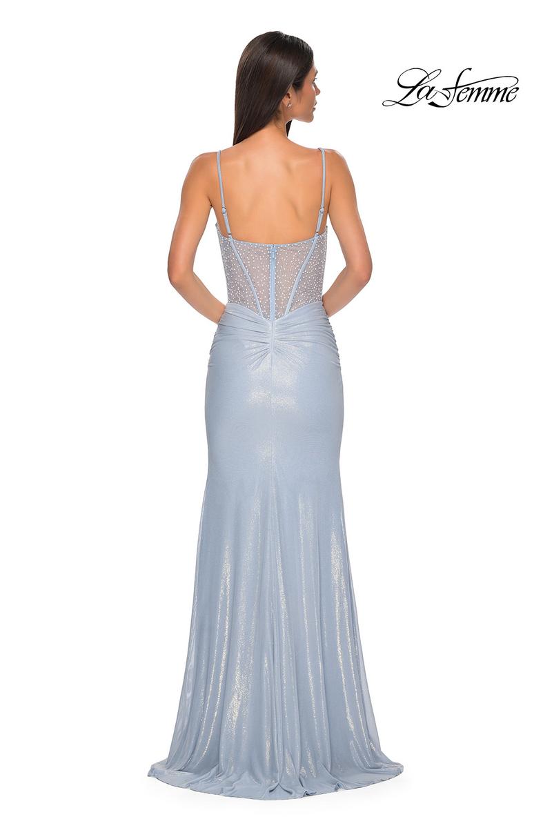 The fabric in this La Femme Prom style is Pearl Rhinestone and Metallic Net Jersey