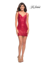 Sparkle the night away in this gorgeous short fitted formal dress designed from La femme. Style 30123 features a low v-neckline with spaghetti straps and a beautiful low back with zipper closure. The fitted gown is entirely adorned in sparkling sequins and slight front leg slit. Wear as a homecoming dress, banquet dress, or a semi formal dress.
