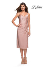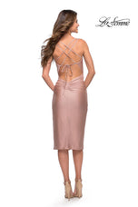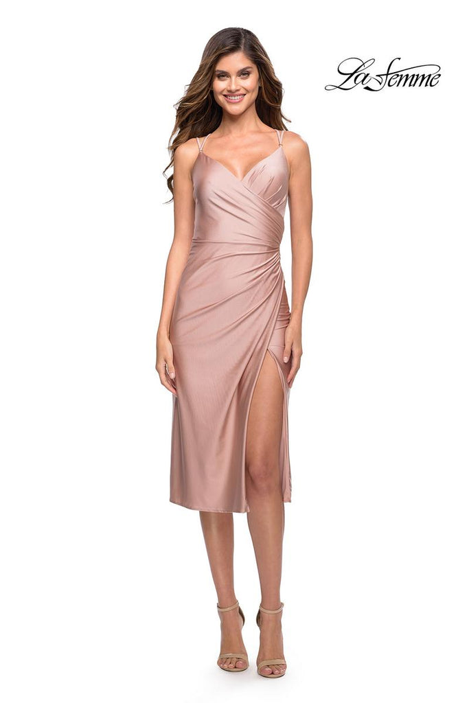 This la Femme cocktail dress is a showstopper! 30918, is from Fall 2022 Collection that showcases a sweet v neckline with thin straps that create an eye-catching lace-up back. The fitted bodice has soft side pleating that will give you a hourglass effect. The skirt is finished off with a side leg slit for a sexy touch. Perfect for any social event!