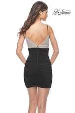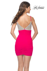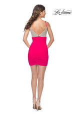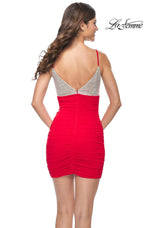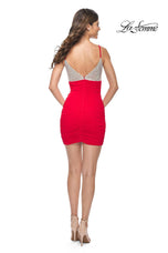 Don't wait much longer and take this La Femme short cocktail home! 31726, has the perfect amount of sparkle and simplicity. A rhinestone top with dainty red straps that lead to a low v sipper back. A form fitting skirt with soft pleated that will enhance your figure and mini hemline. Perfect for Homecoming night and much more!