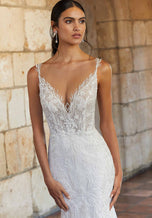 Exquisitely enchanting details make the Gwendolyn designer wedding dress a bridal vision brought to life. Designed by Madeline Gardner for the Fall 2022 Morilee collection, she's as ethereal as she is modern and we're loving the vibe. The soft mermaid dazzles with delicate embroidered lace appliqus accented by patterned sequins and crystal beading. The deep-v neckline has an illusion inset to support the delicate yet comfortable straps and breathtaking low back. Pair the gown with matching detachable bishop sleeves, with a slit in the side, for an extra whimsical touch. Available in three lengths to make alterations a breeze for our petite or tall brides.