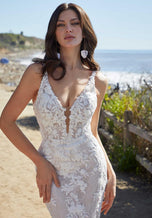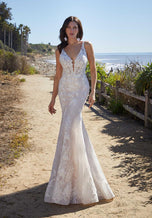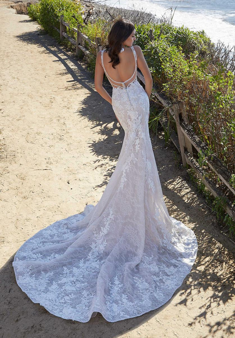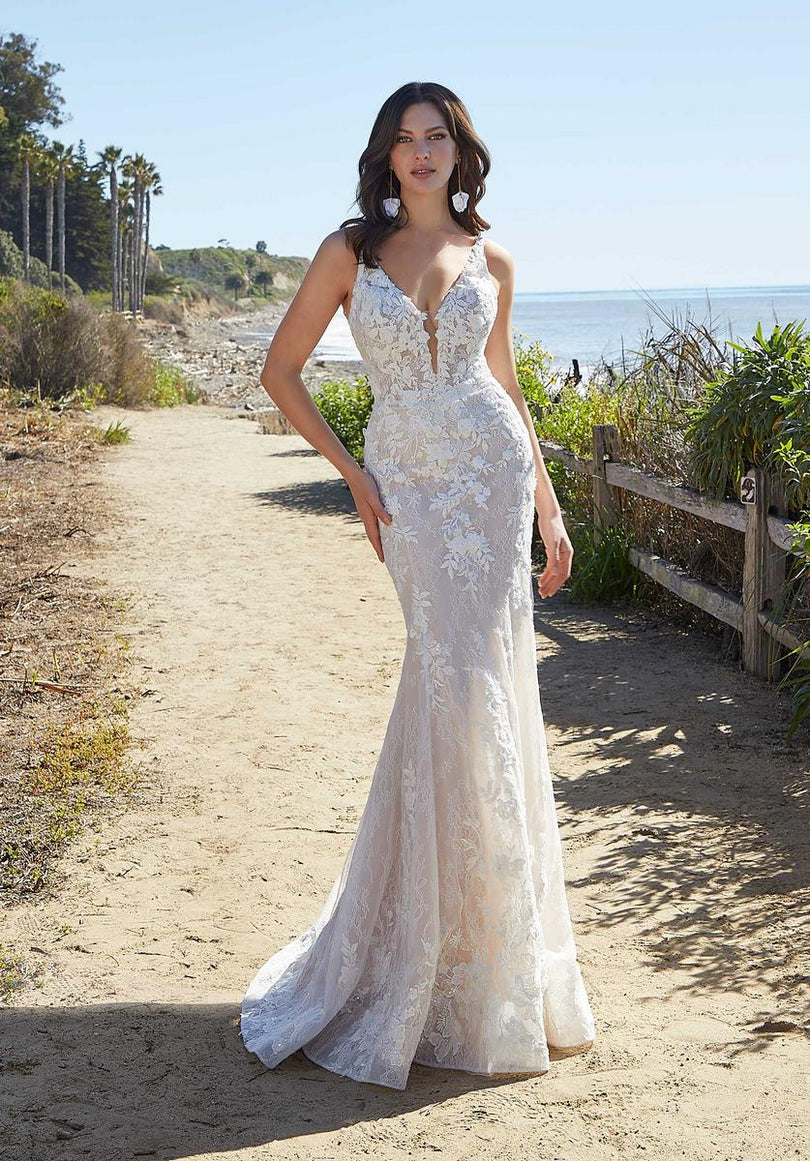 Our Laurette designer wedding dress is an alluring fit and flare in romantic Chantilly lace accented by gorgeous crystal beaded, three-dimensional floral embroidered appliqus. The plunging bodice features boning, offering you structure and support, and a breathtaking open back with illusion detailing and shimmering beading. Shown in Ivory/Champagne/Honey.