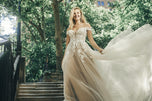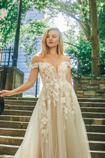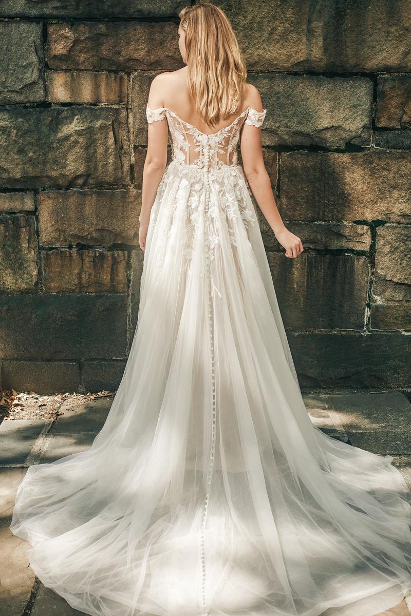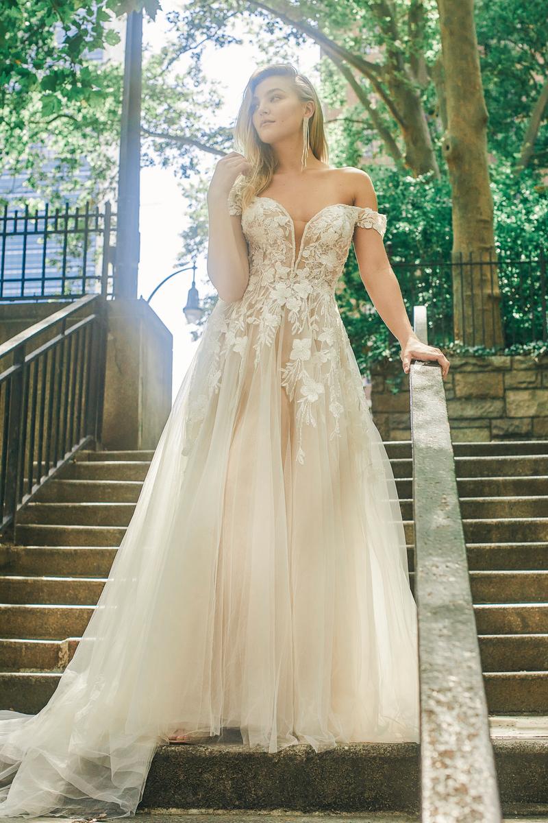 Striking, ethereal and ultra-feminine, the Leah gown is a unique and chic centerpiece of the Spring 2022 Madison James Bridal Collection. Featuring trailing floral appliques across its off-shoulder bodice and illusion back, we're obsessed with her edgy details, including a plunging sweetheart neckline, open illusion back and exposed corset boning. Our stylists are pairing this look with your destination occasion or formal fete! Please call our Dallas, Texas location to check in-store availability, pricing and current ship dates.