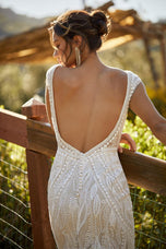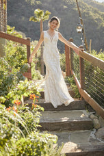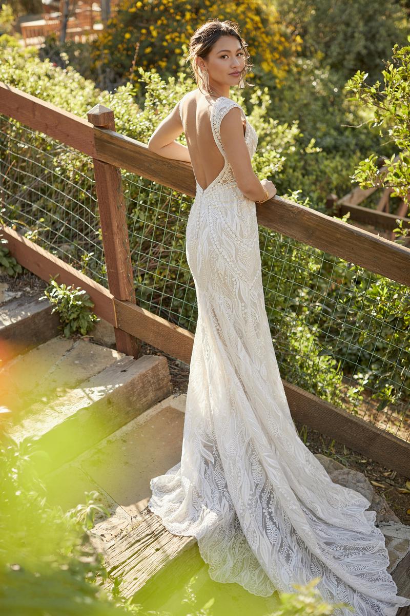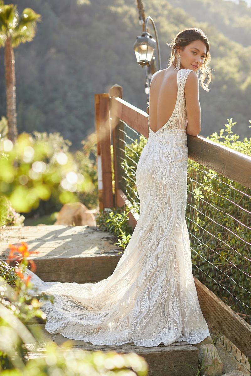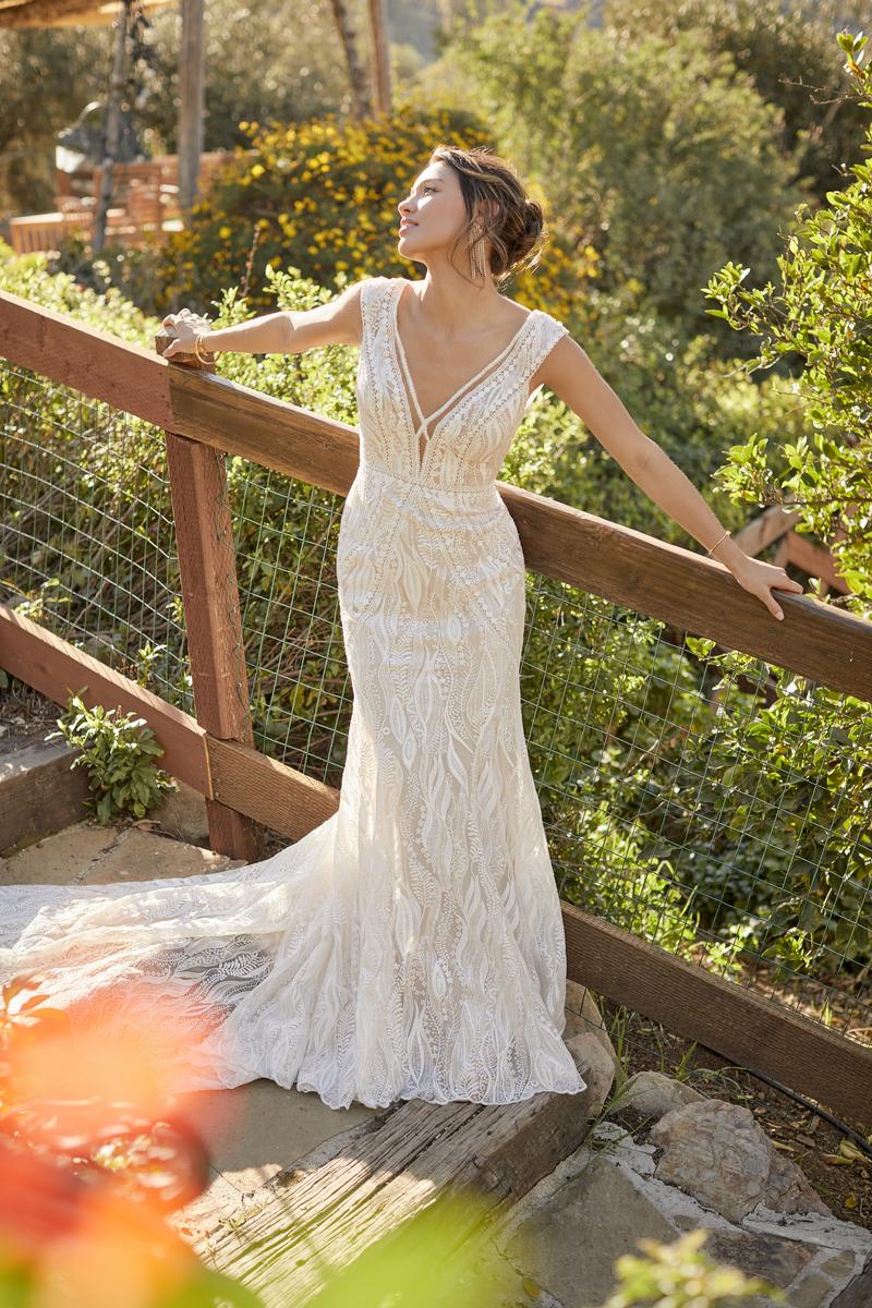Khloe is a simple and sweet yet thoughtfully designed lace bridal gown fit for a boho bride or destination wedding! Created for the Fall 2022 Madison James Bridal Gown collection, she features a plunging neckline and low, open back. Whether you're planning a beach wedding or informal outdoor ceremony, she'll fit right in! Speaking of fit, you'll love her lacy sheath silhouette! Please call our Dallas, Texas location to check availability, pricing and current ship dates.