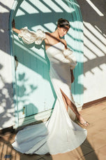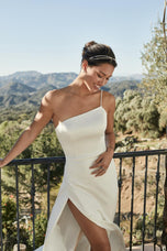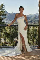 Sleek and chic, this is Kit from the Fall 2022 Madison James Bridal Gown collection. Designed with the sophisticated bride in mind for your destination wedding or formal church affair, we're loving the high asymmetrical neckline and delicate strap! Simple in satin, she's the perfect picture for a fashion-forward bride, finished with a thigh-high side slit! Please call our Dallas, Texas location to check in-store availability, pricing and current ship dates.