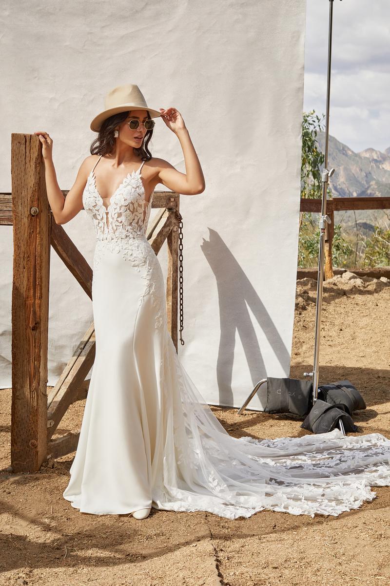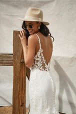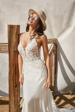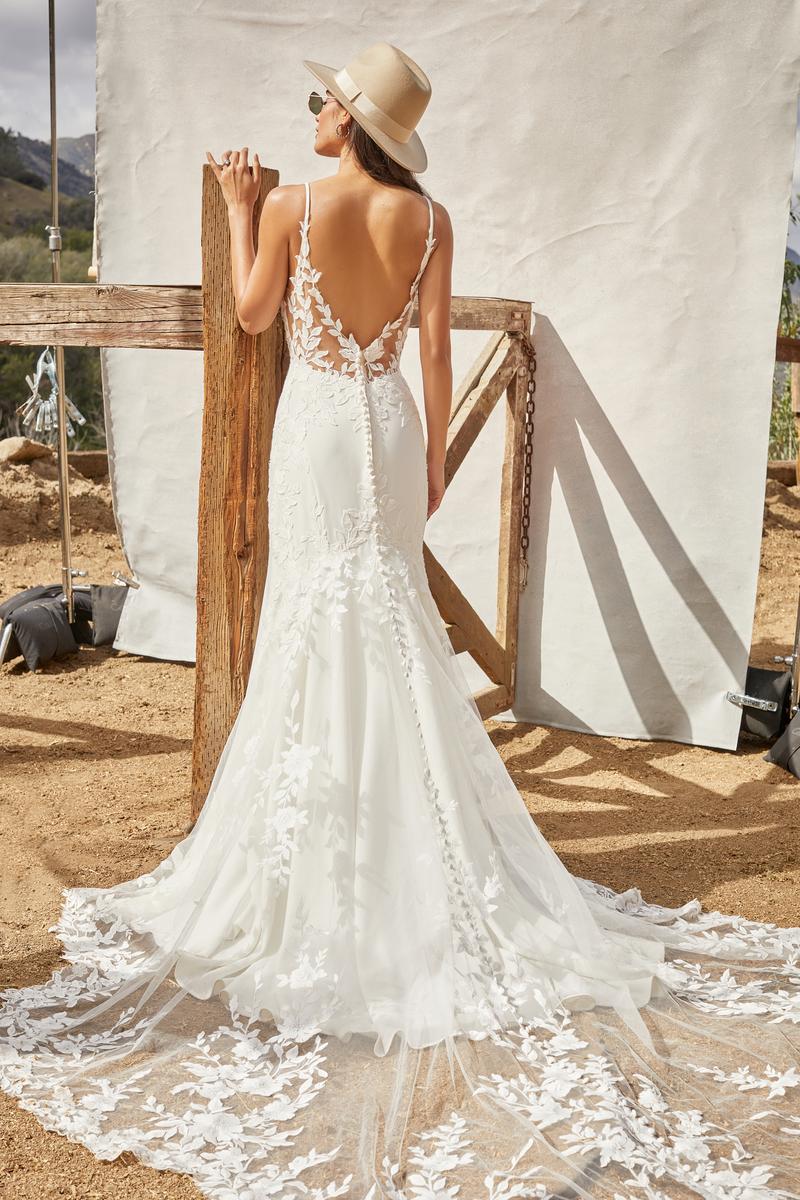 Effortlessly pair classic fabrications with modern design, this crepe and lace bridal gown is Kalani from the Fall 2022 Madison James Bridal Gown collection. She features a breezy, comfy cotton lace with a demurely sexy luxe stretch crepe fitted silhouette. A stunning illusion net train makes her a perfect pick for floating down the aisle at your formal wedding or destination occasion. Whether she's in a wooded wonderland or beach setting, you'll be the most confident one in the room! A plunging illusion back and delicate straps complete the flattering look. Designed with an illusion, lingerie-inspired bodice, she's also available with a lined bodice as style MJ861L for a more modest bridal gown look. Please call our Dallas, Texas location to check in-store availability, pricing and current ship dates.