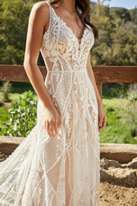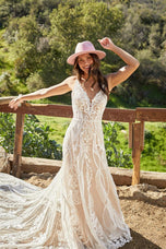 A modern lace dress with architectural details, Kingston's soft cotton lace is strewn across delicate layers of A-line tulle skirting. Designed for the Fall 2022 Madison James Bridal Gown collection, she's perfect for the fashion-forward bride planning her destination wedding or dramatic, elegant outdoor ceremony. We're loving her delicate double straps and flattering a-line silhouette. A plunging v-neckline completes the look and she's also available with a lined bodice as style MJ862L for a more modest bridal gown look. A perfect pick for any body type from apple to hourglass to pear-shaped! Please call our Dallas, Texas location to check in-store availability, pricing and current ship dates.