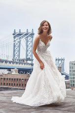 Sequined Chantilly lace and English net compose the elegant Josephine gown, finished with a full skirt and delicate spaghetti straps.Refer to measurements for Size Chart B